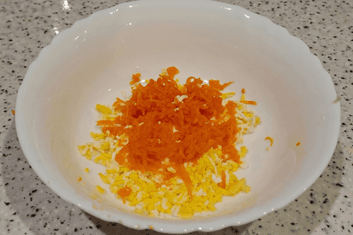 Peel the carrot, grate it on a fine grater, and add it to the grated egg.