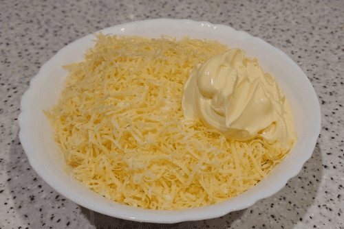 Grate the processed cheese on a fine grater and add it to the container with the grated egg and carrot.