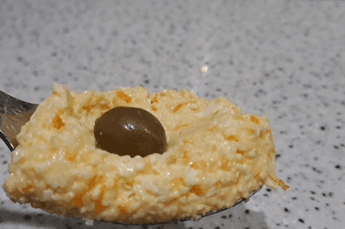 Divide the egg-cheese mixture into ten parts and, using wet hands and a tablespoon, form balls, filling each with a pitted olive.