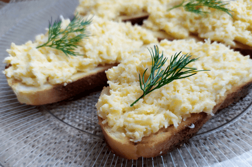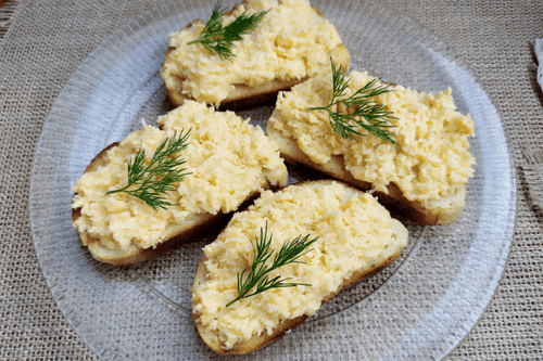Cheese spread with mustard is a simple yet exquisite dish of Russian cuisine that combines the rich creamy flavor of cheese with a spicy hint of mustard. The origins of such a combination trace back to the traditions of preparing snacks for festive and family meals. The spread has a soft texture and tenderness with a slight sharpness that awakens the appetite. It can be served on toasted white bread, creating a contrast between the crispy crust and velvety cheese mass. An ideal option for breakfasts, buffets, and friendly gatherings, while a sprig of fresh herbs not only decorates the dish but also adds fresh aromatic accents. It is quick to prepare and delights with its rich and harmonious taste.