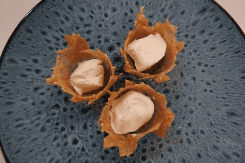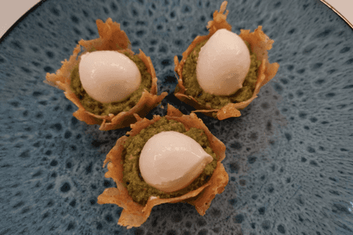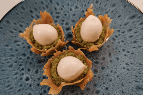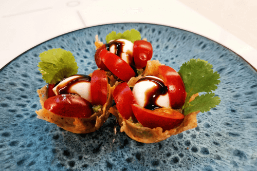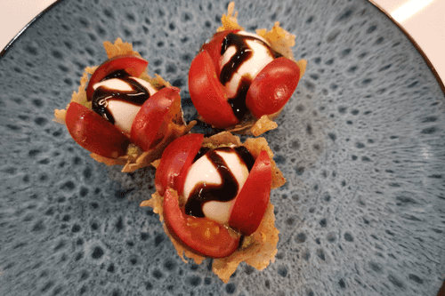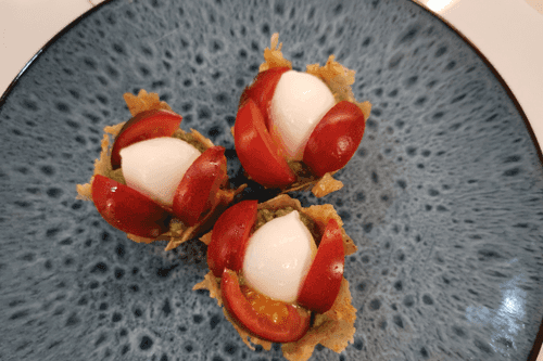 Тарталетки капрезе — это изысканная вариация классического итальянского салата Капрезе, воплощённая в миниатюрных хрустящих тарталетках. История блюда берёт начало с солнечного острова Капри, где сочетание свежей моцареллы, ароматного базилика и сладких томатов символизирует цвета итальянского флага. В этом рецепте традиционные ингредиенты дополняются сливочным творожным сыром и пикантным соусом песто, придавая закуске насыщенный вкус. Лёгкие, хрустящие тарталетки пропитываются ароматами свежей зелени и бальзамического крема, создавая неповторимую гармонию вкусов. Это идеальное блюдо для изысканного аперитива или лёгкого перекуса, которое украсит любой стол и подарит ощущение итальянской гастрономической магии.