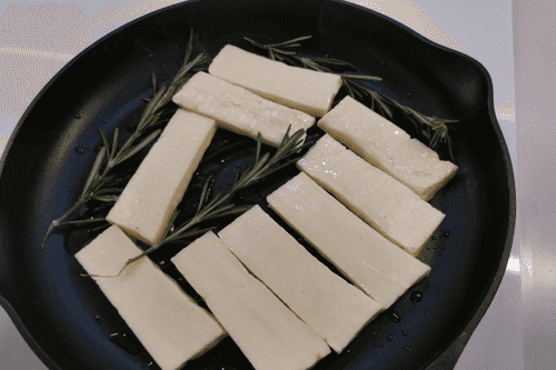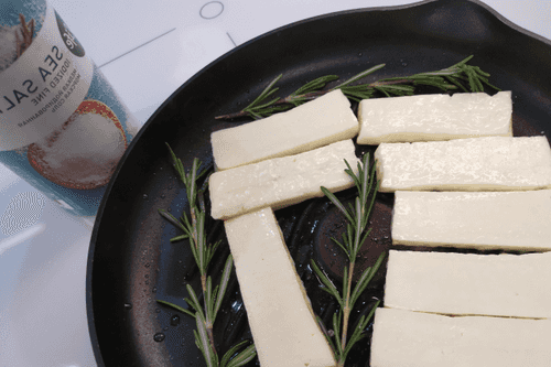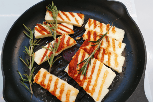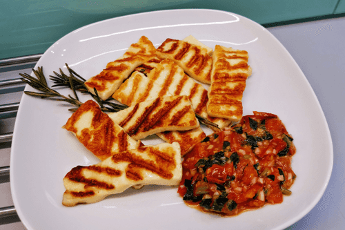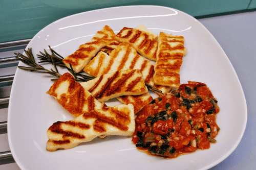 Halloumi on a skillet is a traditional Greek dish that combines tender cheese with the spicy aroma of rosemary and fresh vegetables. Halloumi cheese, known for its dense and elastic texture, is grilled in a hot skillet until it develops a golden crust and rich flavor. The garnish of spinach, cherry tomatoes, and garlic adds freshness and a slight tang to the dish. Olive oil enhances the depth of flavor while sea salt accentuates its naturalness. This dish is perfect as an appetizer or light main course, especially on warm summer evenings. It can be served with sauce or fresh herbs for an authentic Mediterranean delight.