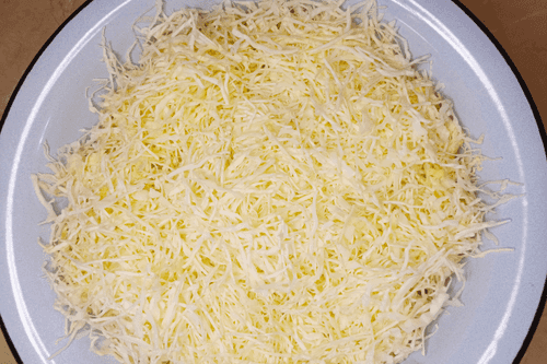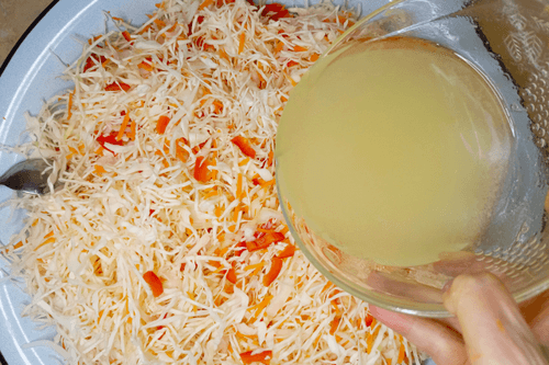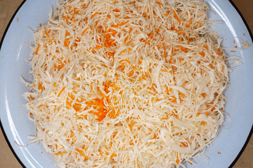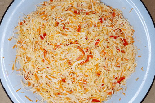 Transfer the cabbage to a bowl, add the carrot, mix, gently mashing.