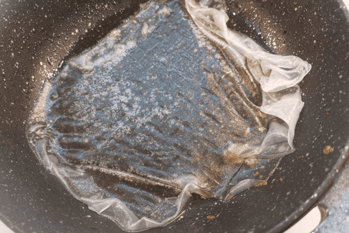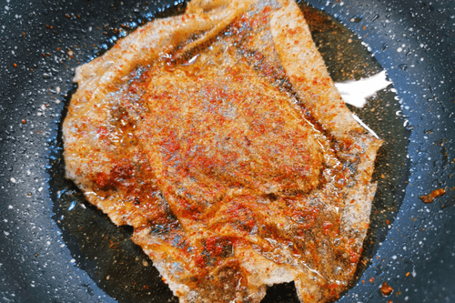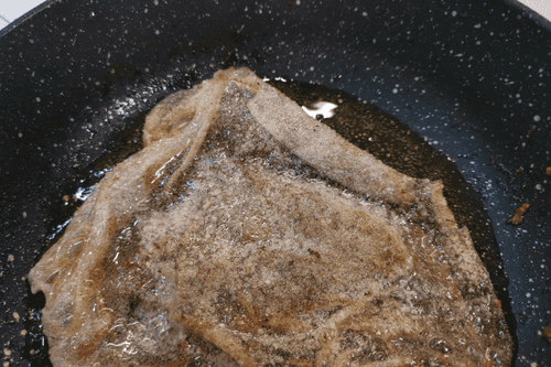 Pour into the heated oil in the frying pan.