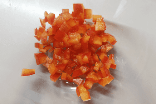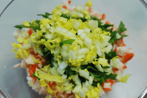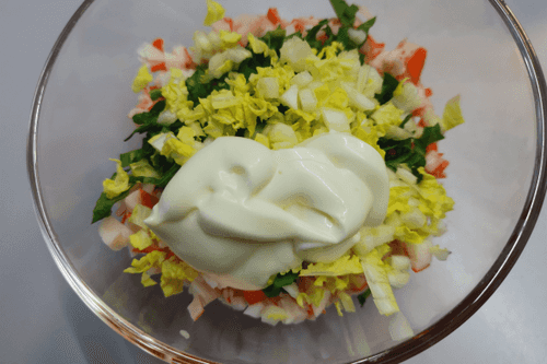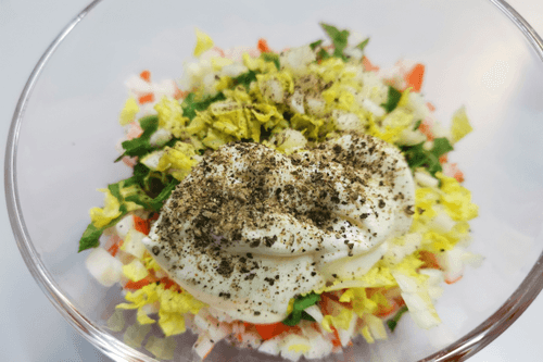Finely chop the greens and crab sticks. Combine them in a deep bowl with pepper.
