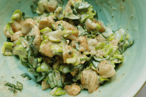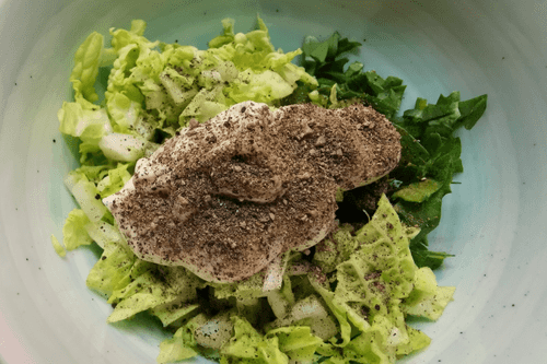 Combine finely chopped arugula and Beijing cabbage in a deep bowl. Dress with mayonnaise and add pepper.