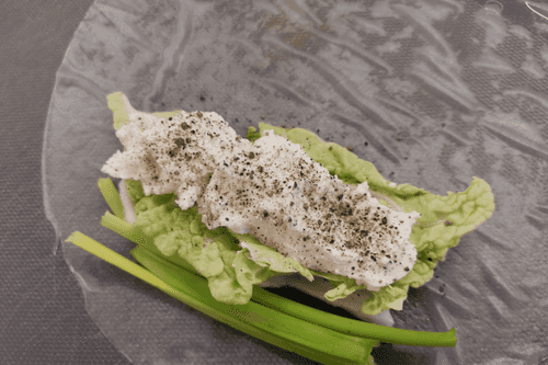 Lay out the Beijing cabbage, onion on the edge, and spread with cottage cheese. Add pepper.