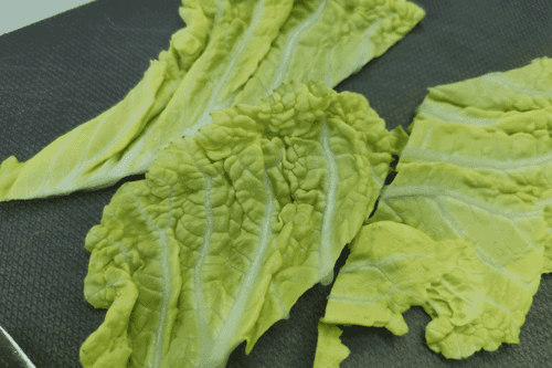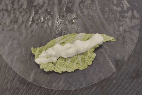 Place the wet leaf on a flat surface. Top it with a leaf of napa cabbage and spread mayonnaise on it.