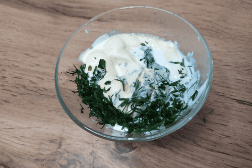 For the sauce, mix equal parts of mayonnaise and sour cream, add salt, garlic, dill, and ground pepper to taste.