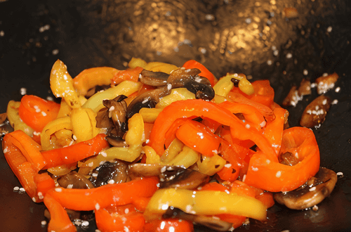Pour sesame oil into a heated wok and start frying the mushrooms, stirring vigorously. Once the mushrooms begin to brown, add the chopped peppers and fry until the latter are soft.