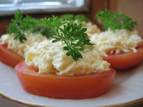 Tomatoes with cheese and garlic are a simple and tasty snack from Soviet cuisine, where quick, affordable, and hearty dishes were valued. The combination of juicy tomatoes, spicy garlic, and creamy cheese creates a harmony of flavors: the freshness of the tomatoes contrasts with the sharpness of the garlic, while the cheese adds creaminess. A boiled egg adds tenderness, and mayonnaise unites the ingredients into a whole. This dish is perfect as an appetizer for festive tables; it can be served on sandwiches or used as a side dish. The simplicity of preparation and availability of ingredients have made it popular in family lunches and gatherings. Black pepper and herbs complete the composition, enhancing the aroma. A light yet rich snack that can adorn any feast.