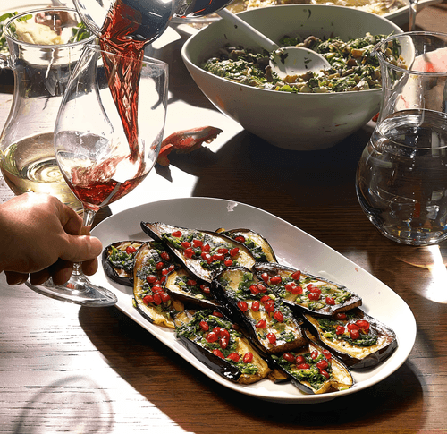 A Georgian classic in which the tart, pungent taste of eggplant is tamed by a soft pomegranate sauce.