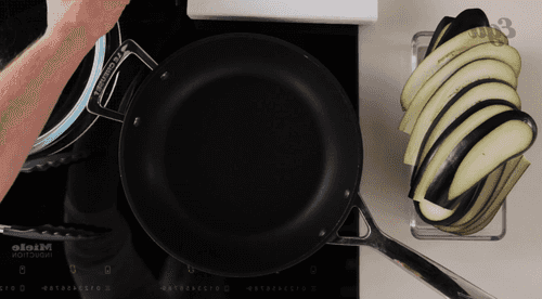 Heat the pan, pour oil into it, and fry the eggplants in a single layer one at a time.