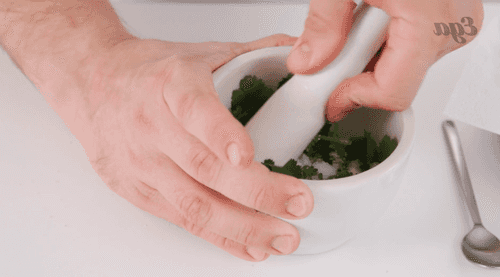 Thoroughly crush cilantro, garlic, and salt in a mortar to a paste, losing all individual characteristics.