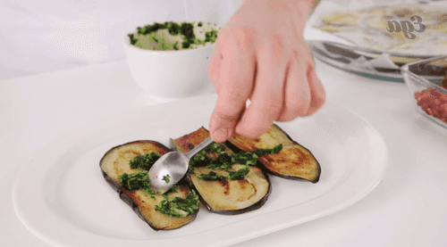 Cut off the stem of the eggplants and, without peeling, slice them into pieces five millimeters thick. One eggplant should yield four to five slices and two side pieces, which should be discarded or used for another dish.