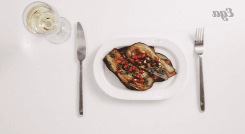 Sprinkle the eggplants with pomegranate seeds before serving. This dish can be eaten hot or cold.