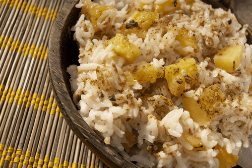Cook rice in salted water and pineapple juice until soft and liquid is fully evaporated. Add chopped pineapples, brown sugar, lemon zest, lemon juice, and nutmeg. Mix well.