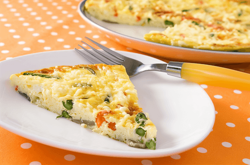 Fill the forms one third with vegetables, then pour the egg mixture on top to cover the vegetables. Place the remaining vegetables on top of the eggs and press down slightly. Pour the remaining egg mixture over it.