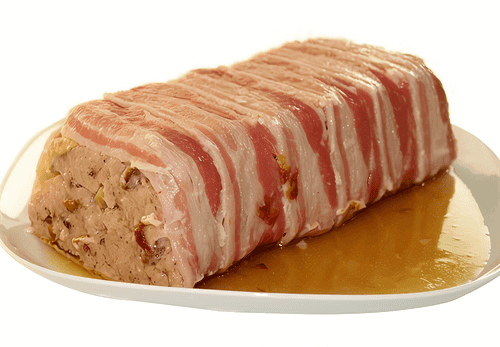 Preheat the oven to 150 degrees. Place the minced meat in the prepared dish and cover with the remaining bacon. Cover with foil. Place the dish in a deep baking tray and fill halfway with boiling water. Bake in the oven for 1 hour. Remove the foil and bake for another 30 minutes.
