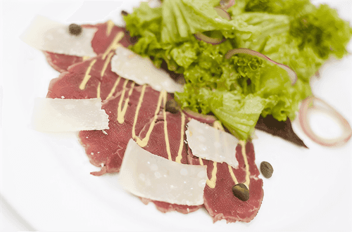 Dried beef carpaccio with vegetable salad, ginger and coriander