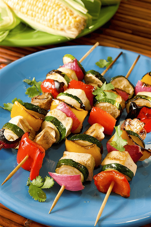 Cut the vegetables into small pieces and thread them onto sticks with mushrooms. Brush with vegetable oil and sprinkle with salt and pepper.