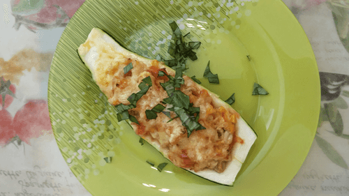 Stuff the zucchini with vegetable filling, sprinkle with grated Lambert cheese, and bake in the oven at 170 degrees for 15-20 minutes.