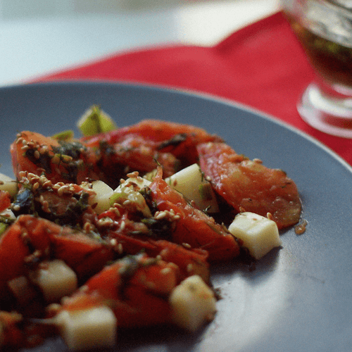 In the summer, it's a way to prepare a light hot dish, and the rest of the year, it's an opportunity to bring summer closer. The salad mix can be anything - tomatoes are happy with any neighbor.