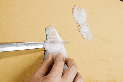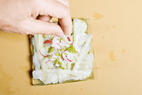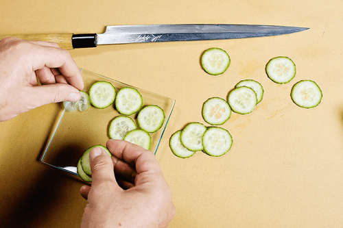 Place the sea bass fillet in front of you on a board and, using a long fish knife, carefully slice thin pieces away from you until only the skin remains. If the skin accidentally gets on the pieces of flesh, it should be cut off. Lay the fish slices on the cucumbers in the same dense and thin layer as before.