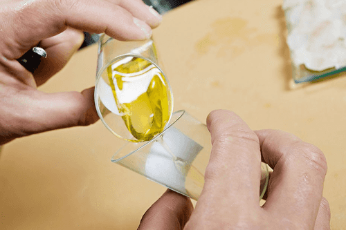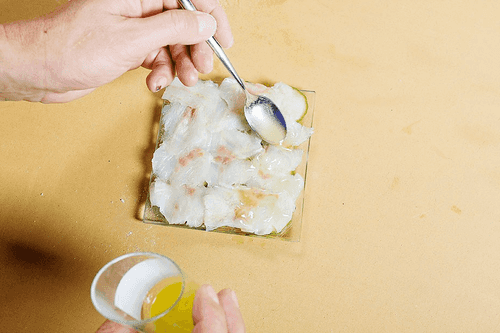 Squeeze about a quarter of a lemon — you'll need one tablespoon of fresh lemon juice for tiradito. Mix it in a small container with two tablespoons of olive oil. The more aromatic the oil you choose, the better. Mix vigorously to achieve a cloudy, homogeneous mixture that doesn't separate into layers.
