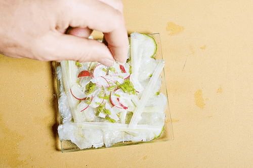 Slice the celery stalk into very thin long strips, half of the fresh radish into similarly thin half-moons, and chop one green onion into small rings. Arrange the celery on the fish, then create a mound of radish and onion on top. Lightly sprinkle everything with salt and pepper again.