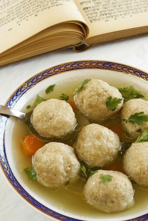 Matzah balls with parsley and sage are a traditional Jewish dish associated with Passover. Matzah, the base of the recipe, symbolizes the story of the Exodus from Egypt. These airy balls infused with the aromas of parsley and sage acquire a delicate texture thanks to soda water. Their flavor is mild with herbal notes complemented by a slight spiciness of black pepper. Preparation requires patience: the dough is chilled, formed into balls, and cooked for a long time until surprisingly tender. They are served as a standalone dish or in broth, making them an ideal warming treat. They pair wonderfully with traditional Jewish soups, filling the meal with comfort and warmth.