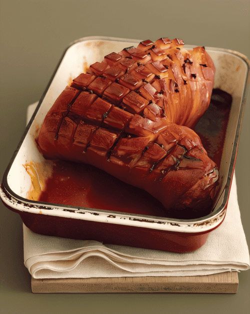 Baked ham in brown sugar, Coca-Cola, and bourbon is a true gastronomic delight with deep roots in European cuisine. While elements of this dish resemble American cooking, its sophistication and balance of flavors hark back to French traditions. The sweet caramelized crust with hints of spicy mustard and bourbon gives the meat a rich flavor, while Coca-Cola softens the texture of the ham, making it tender and juicy. Cloves infused with roasting juices add a subtle Eastern aroma. This dish is perfect for festive tables, accompanied by vibrant sides and rich sauces. It is served in warm family circles, bringing people together over a delicious meal full of history and traditions.