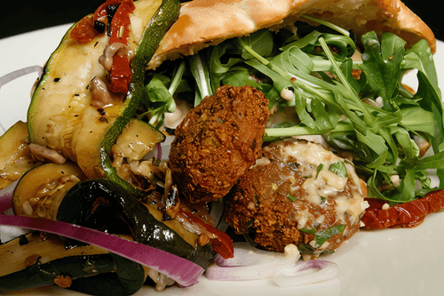 Pita with spicy meatballs, arugula, harissa mayonnaise and potato wedges