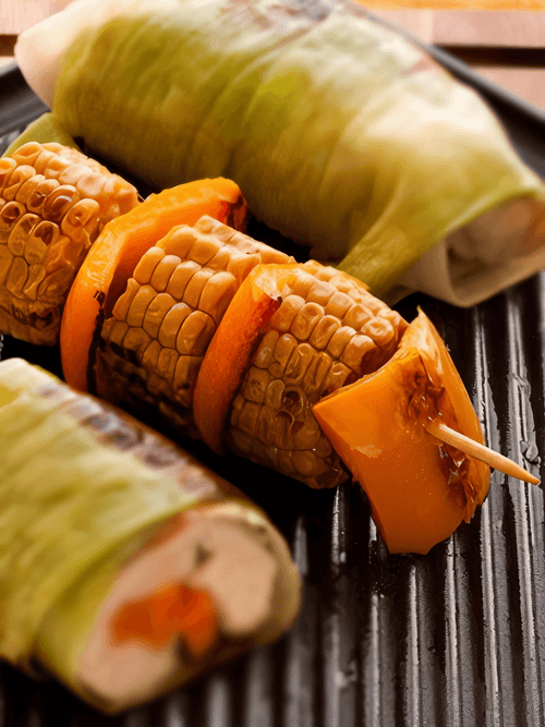 Multicolored pepper and corn kebabs grilled in aromatic cumin oil