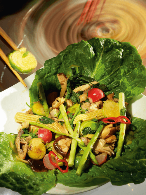 Remove the cabbage, sauté mushrooms in a pan, take them out, sauté asparagus and corn, take them out, sauté radishes. Then add soy and fish sauces, lime juice to the pan, mix, return the other vegetables and roughly chopped cilantro, mix, simmer for a minute or two, and serve.