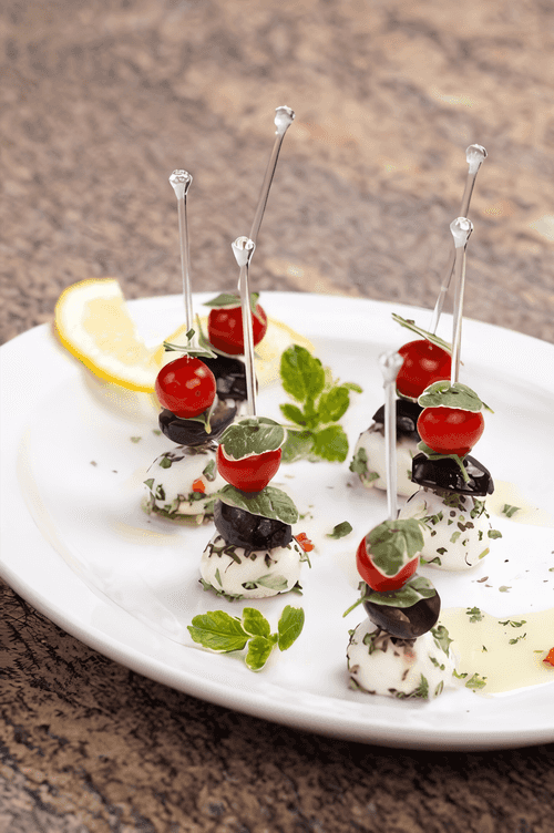 Canapes with feta marinated in citrus juice and fennel, olives and mint