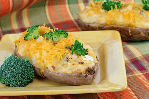 Make crosswise cuts on the potato, peel it back, and remove a small amount of flesh. Place 1 tablespoon of feta in each and top with broccoli. Sprinkle with the remaining feta on top.