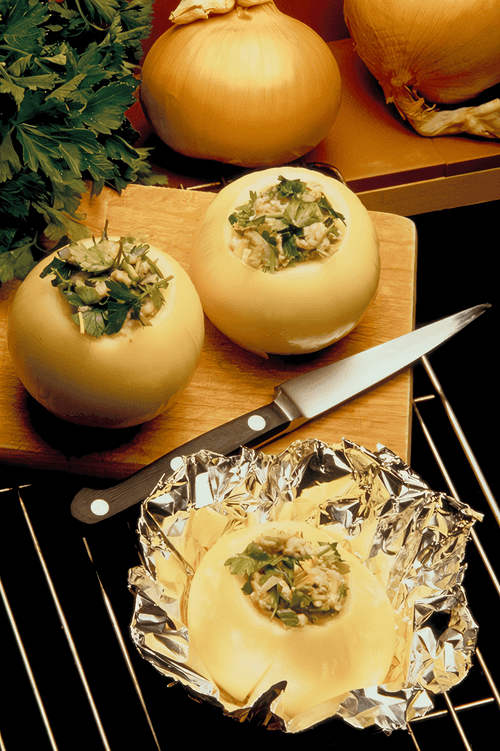 Baked onions stuffed with feta, parsley and thyme
