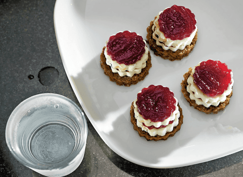 Cut circles from frozen cheese slightly smaller than bread, and from caramel beet the same size as the cheese. Layer them to make a cake: beet, cheese, beet, cheese. Stop at about five levels — until the height exceeds the ability to open your mouth. Place all of this on bread.