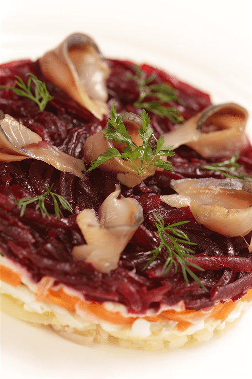 Lightly salted Atlantic herring under a coat of young vegetables is a refined dish of Norwegian cuisine that combines the freshness of sea fish and the tenderness of young vegetables. This recipe is inspired by the traditions of northern peoples, where herring is an important element of gastronomic culture. The combination of lightly salted herring with boiled vegetables, airy layers of grated egg white, and aromatic herbs creates a harmony of flavors—from the light saltiness of the fish to the sweet softness of beets and carrots. Creamy mayonnaise binds the ingredients together, highlighting their textures, while fresh chervil and dill add subtle herbal notes. This dish is perfect for both festive gatherings and cozy family dinners, delighting the eye with its bright layered presentation and refined balance of flavors.