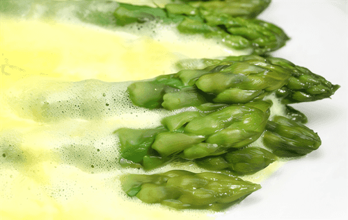 Boil the asparagus in salted water, place it on lettuce leaves, and drizzle with sauce.