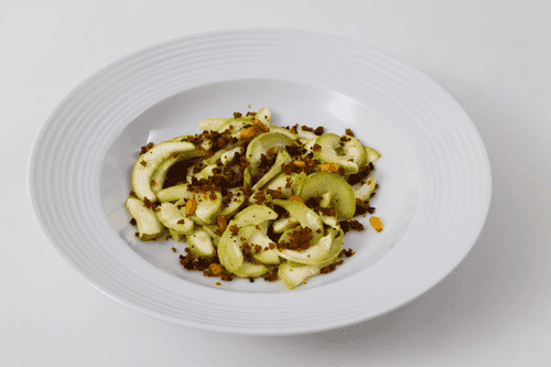 Place both trays in an oven preheated to 180 degrees for fifteen minutes. Then remove and sprinkle the zucchini with baked breadcrumbs and sun-dried tomatoes.