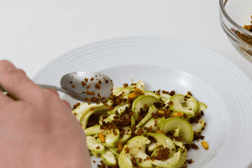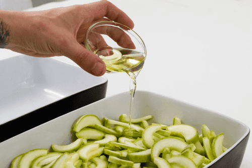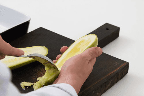 Cut the zucchini in half, scoop out the seeds, and then slice into half-rings.