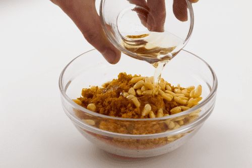 Blend the bread crumb with sun-dried tomatoes and thyme leaves. Mix the resulting mash with a tablespoon of olive oil, pine nuts, season with salt and pepper, and spread it on a baking sheet.