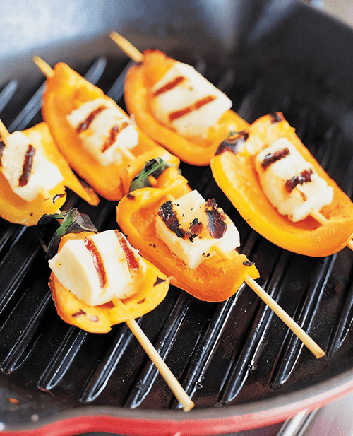 Thread peppers stuffed with halloumi cheese interspersed with basil leaves onto wooden skewers. Grill for 5-7 minutes.