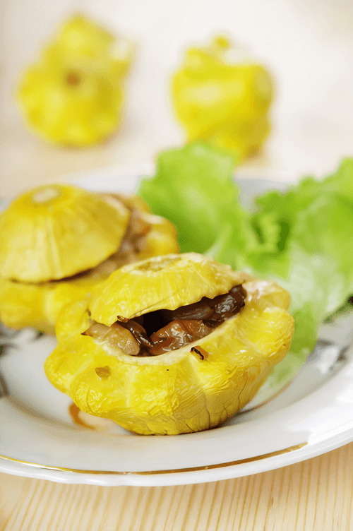 Stuff the patty pan squash cups with the mixture and place them in a greased deep baking dish. Cover with lids on top. Add half a cup of water or broth and simmer in the oven for 30 minutes.