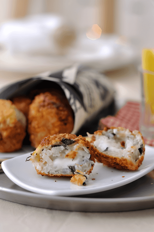 Rice croquettes with gorgonzola are a true embodiment of European culinary sophistication. This dish originated from the Italian tradition of croquettes, where soft rice envelops a tender core of tangy gorgonzola cheese. When deep-fried, they acquire a crispy golden crust that contrasts with the tenderness of the melting cheese inside. The rich creamy-spicy flavor of gorgonzola makes them an ideal appetizer or complement to a main dish. Serving on fresh salad leaves adds lightness and balances the richness of flavor. These croquettes are a great treat for both festive tables and cozy evenings with a glass of white wine.