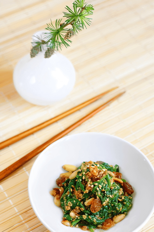 Fried spinach with raisins, garlic and pine nuts