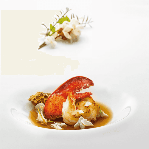 Place the lobster meat on plates. Pour consomme over it. Garnish with pieces of honeycomb and flowers of acacia and citron.