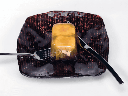 Remove the skin from the salmon fillet. Cut into cubes with a side of one to one and a half centimeters and place in oil. The oil is boiling at 70 degrees, and you need to maintain the temperature just below — it is ideal for poaching seafood, in four to five minutes the fish will be ready, losing almost nothing from thermal processing. After the time is up, transfer the fish from the sauce to a small mold, trying not to break the cubes, and let it cool.